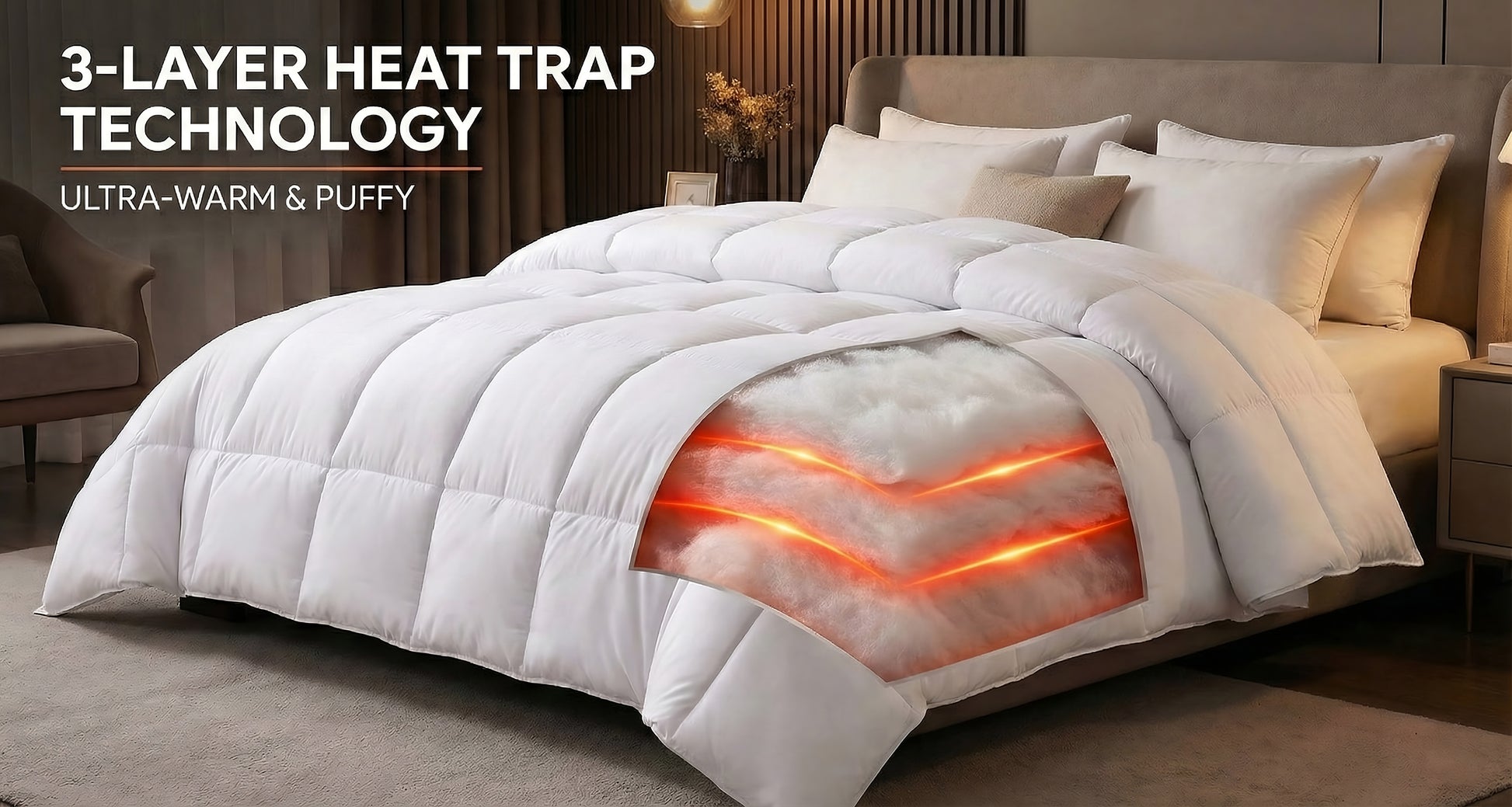 Indulge in the art of cozy living with the Daily Loom Premium King Size Duvet, designed to turn your bed into a cloud of softness. We believe true luxury is how you feel when you unwind, which is why our comforter is crafted with an exclusive 3-layer heat-trap technology. Using 300 GSM of the highest quality microfiber, layers are stacked and stitched to lock in warmth, offering superior insulation without the heavy weight of traditional winter razais. The elegant box-stitching pattern keeps the filling fluffy and evenly distributed, preventing lumps and ensuring a plush, hugging sensation all night long. Proudly Made in India, this ultra-soft, white quilted duvet is not just bedding; it is a warm embrace on a cold day. Breathable, hypoallergenic, and irresistibly puffy, it is the ultimate winter essential for those who refuse to compromise on comfort.