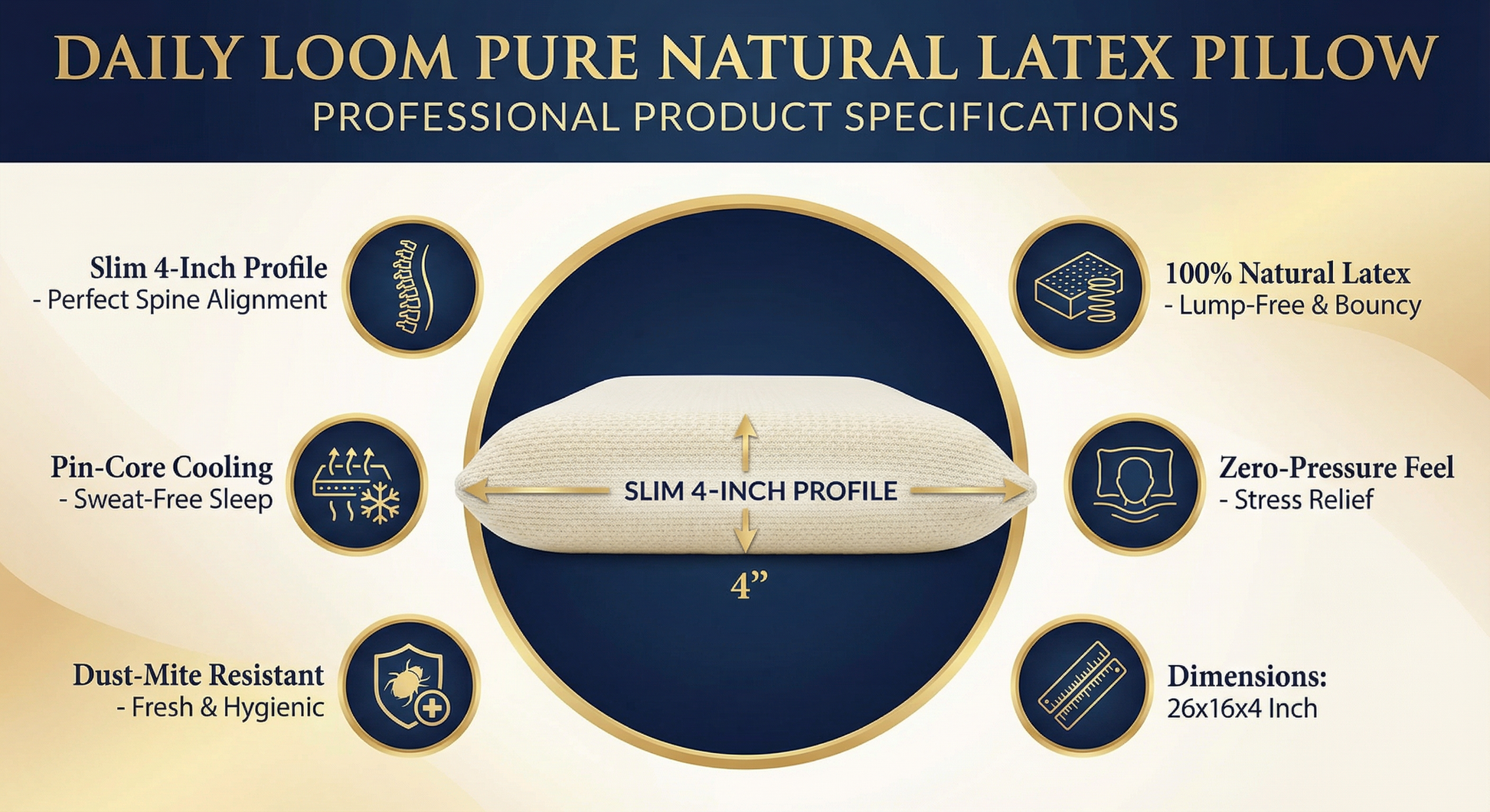 Daily Loom Pure Natural Latex Pillow (Slim 4") - Premium Spun Knitted Shell | Cooling, Lump-Free Takiya | Zero-Pressure Orthopedic Support for Stomach & Back Sleepers (26x16x4 Inch)